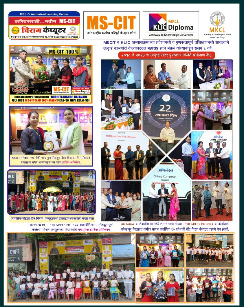 Established in 26 Jan 2002, our Chirag Computer Wadanage center has been a cornerstone of IT education in kolhapur, Maharashtra, India, for over 23 years. We are dedicated to empowering students with essential computer skills through a robust array of courses provided by MKCL (Maharashtra Knowledge Corporation Limited) and other respected organizations. Our founder’s vision was to bridge the gap between technology education and accessibility, ensuring learners receive comprehensive guidance and support.